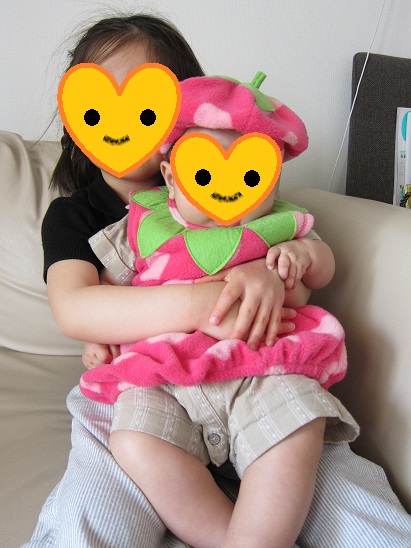 「イチゴの着ぐるみ」を 着て ごきげん姉妹。